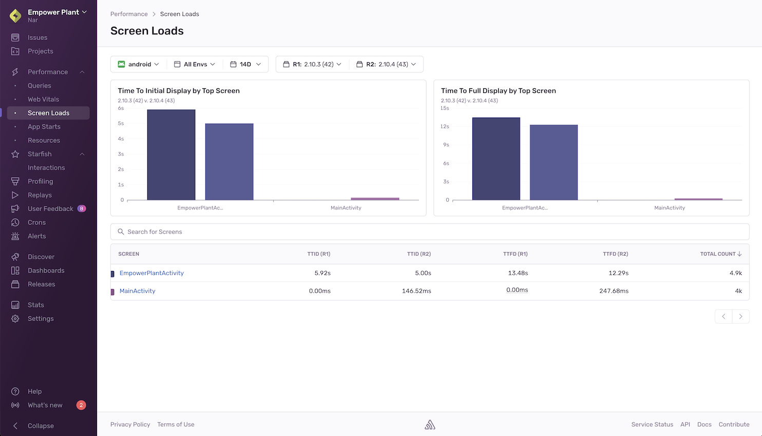 The Screen Loads page shows an overview of the amount of time it takes for your application to load its screens. It helps you identify slow or regressed screens and gives additional information so you can better understand the factors contributing to the slowness of both time to initial display (TTID) and time to full display (TTFD).