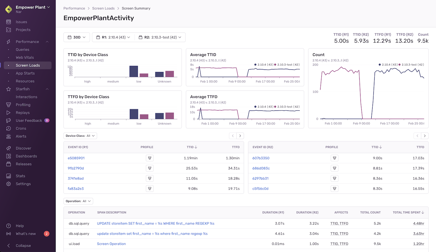 The charts section shows a comparison of TTID and TTFD for your top five screens across your two selected releases.
